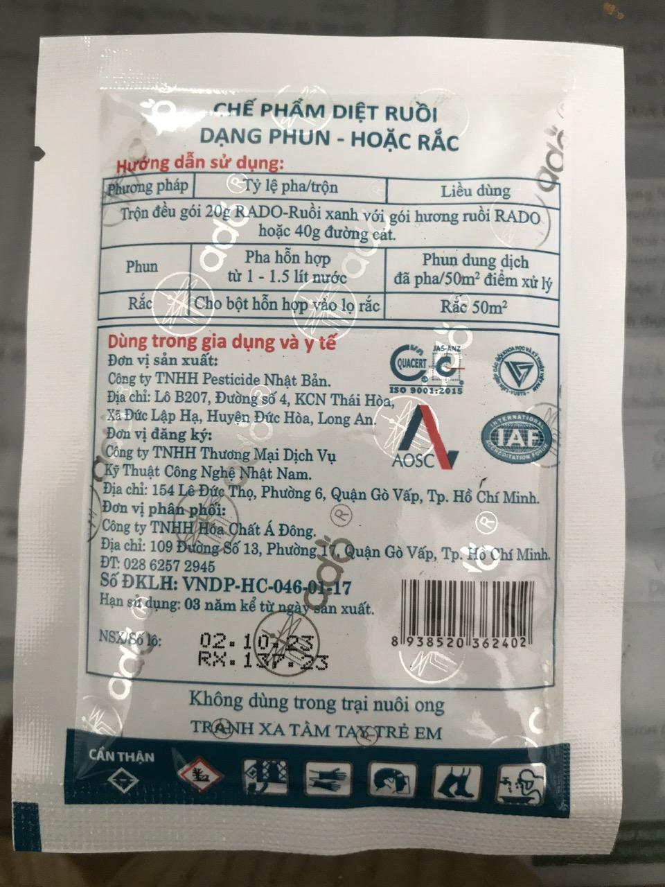 Giá thuốc diệt ruồi RADO .Thuốc diệt ruồi RADO được sản xuất ở dạng gói 20gram và dạng lọ ( hũ ) 500gram