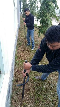 Phun thuốc phòng chống mối dọc chân tường, sàn và vách công trình ( phun vách cao từ 1.5m trở xuống), các khuôn viên cửa chính. Bên ngoài dọc chân tường nhà yến dùng xà beng đâm các lỗ rộng khoảng 3-5 cm, sâu 20-30cm, so le nhau.