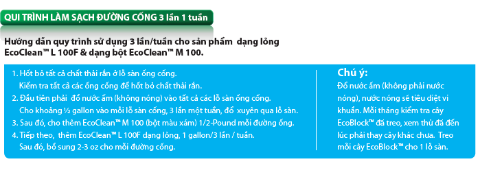 EcoCleanTM L-  100F vi sinh chống tắc mỡ cống thoạt nước, dạng lỏng được phối trộn nhiều chủng vi sinh với mật độ cao. Các chất xúc tác enzyme sẽ giúp tăng tốc hoạt động của vi khuẩn làm sạch có trong sản phẩm.